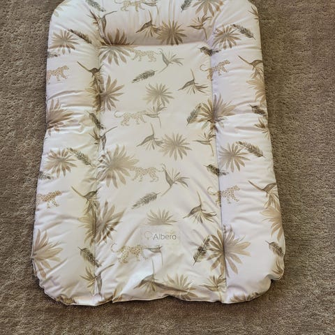 Hoitoalusta, jossa on elefantti kuviointi. Väri on harmaa. Käytännöllinen ja mukava alusta vauvan hoitotoimenpiteisiin.