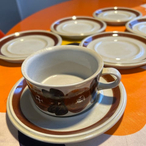 Arabia Rosmarin kahvikupit tasseineen ja pullalautasineen 2kpl. Mallia on valmistettu vuosina 1961-1972 ja Koristeen on suunnitellut Ulla Procope.