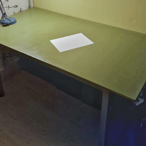 Työpöytä, levyn pinnassa läpivientireiät sähköjohdoille.