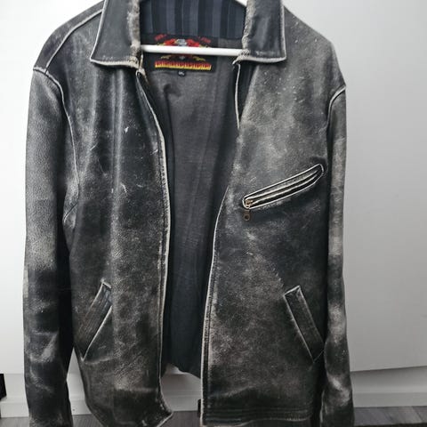 Reilunkokoinen nahkatakki isolle aikapojalle. Noin 128/49cm rinnan/hihan mitat.