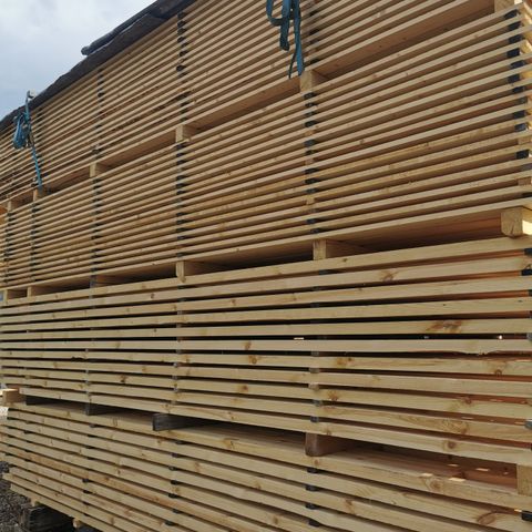Useita vuosia sisätiloissa kuivunutta sahattua kuusilautaa ja lankkua.