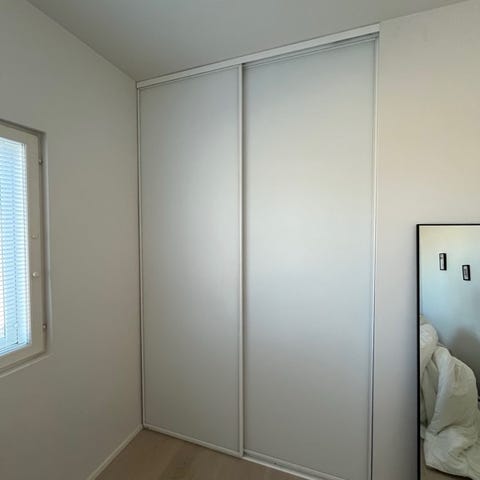 Myydään valkoiset Finnmirror/Inaria liukuovet 2 kpl. Liukuovet on mitoitettu leveydeltään 1350mm ja korkeudeltaan 2700mm aukkoon.