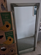 Myydään hieno hyväkuntoinen hopeareunainen iso peili, takana valmiina kiinnityshelat. Koristeelliset reunat. Nouto Ritaharjusta. Peili on 72x162 cm.