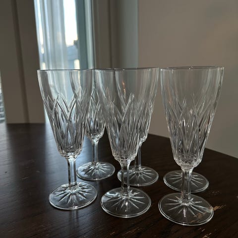 Myydään kuvamukaiset norjalaiset käsinpuhalletut kuohuviini/jälkiruokaviinilasit 6kpl. Korkeus 20,3-20,6cm. Suuaukon leveys 7,7cm.