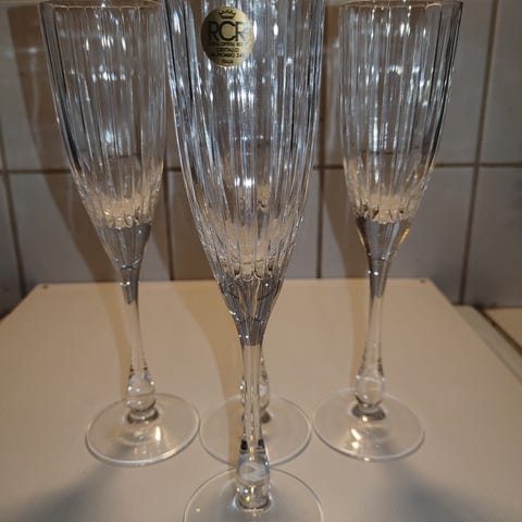 Myydään kuvanmukaiset samppanja- /kuohuviinilasit 2kpl. Käsinpuhallettua kristallia, jossa timanttikaiverrettu kuvio. Korkeus 25cm ja suuaukon leveys 7cm.