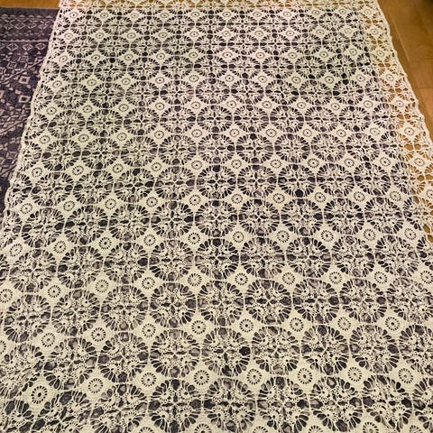 Luonnonvalkoinen puuvillainen ristipistoin kirjottu liina, jossa samoin käsinvirkatut pitsiosiot. Täysin tahraton ja kaikin puolin ehjä, juuri pesty ja silitetty!