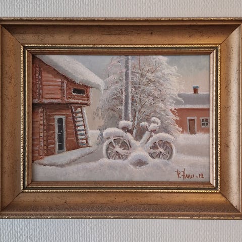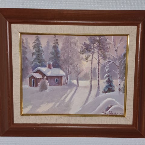 Nastolan taideyhdistyksen jäsenen Pekka Haalin kankaalle maalaama öljyväriteos "Mökki kuunvalossa". Signeeraus "P. Haali - 99". Erittäin hyväkuntoinen kauniita kehyksiä myöten. Taulun takana on kehykseen painettu aitoustodistus teoksen tarkempien tietojen kera.