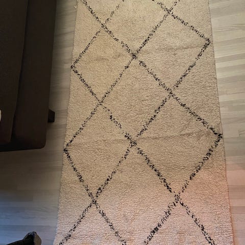 Käyttämättä jäänyt puuvillamatto, ajateltu alun perin keinutuolin alle mutta ei koskaan käyttöön päätynyt. Sävy luonnonvalkoinen.