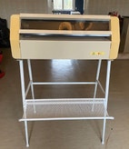 Iäkäs, mutta hyvin toimiva UPO:n kotimainen mankeli. Ikäisekseen siistissä kunnossa. Omilla jaloillaan seisova. Esiin taitettava kori mankelista tuleville tekstiileille.