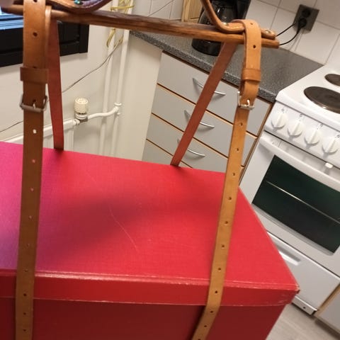Kankaiset, nahkaremeli kiinnitys. Pituus 32cm,leveys 8.5cm.