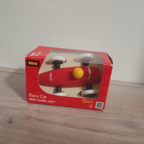 Brio rakennussarjan kilpa-auto. Kerran kasattu ja purettu. Kaikki muut osat tallessa, paitsi yksi mutteri (kuvassa) hukassa. Ohjekirja löytyy.