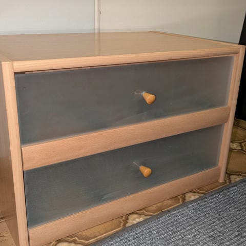 Pöytälevyn alla kaksi isoa laatikkoa ja kaksi pienempää. Avautuvat hieman nytkytellen.