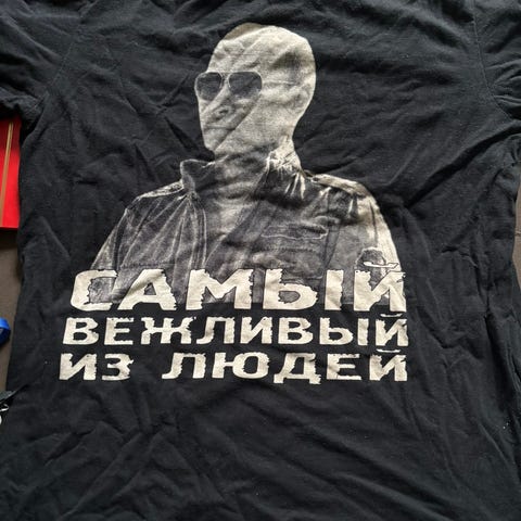 Vanha vintage t-paita Putinista, johon on käsin maalattu punainen aseen tähtäin. Ikäänsä nähden hyväkuntoinen paita.