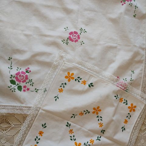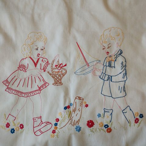 Käsin kirjailtu puuvilla kankaalle.