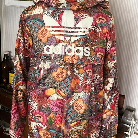 Värikäs suht. pitkä ja ohut Adidaksen kuoritakki. Muuten kuin uusi, mutta niskalenkki on irronnut toisesta päästä. Alhaalla resorissa kiristysnauhat.