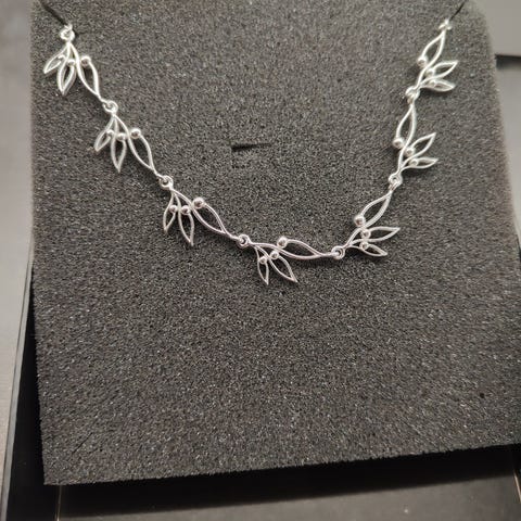 Lumoava Pihla-kaulakoru paketissaan, mukana myös pieni esite.