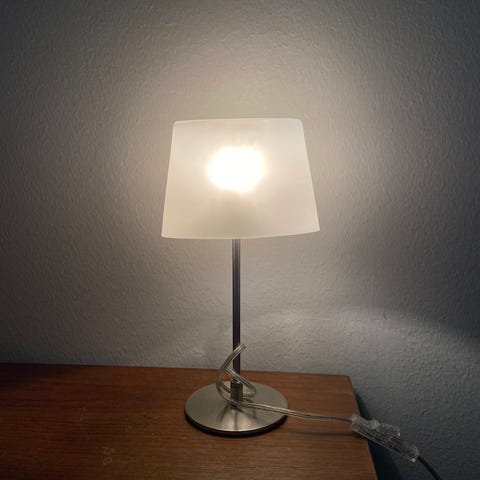 Tyylikäs ja kaunis pyöreä pöytävalaisin. Korkeus 24cm, halkaisija n 30cm ja johdon pituus n 2m.