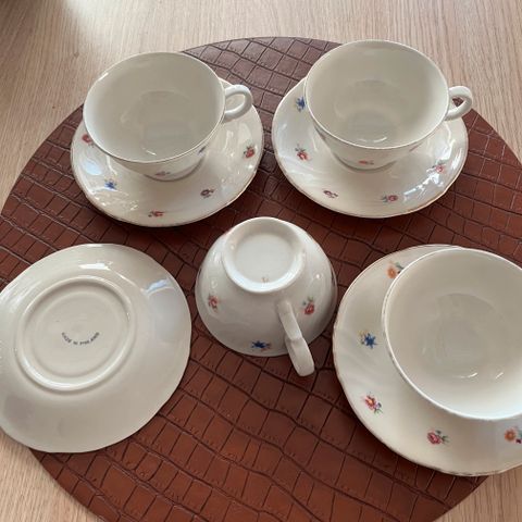 Kaikki osat erittäin hyvässä lähes käyttämättömässä kunnossa. Lautasissa, vadissa ja kulhoissa ihan muutamia hentoja jälkiä, ehkä pinoamisesta. Kuppien tasseissa enemmän naarmuja kupista.