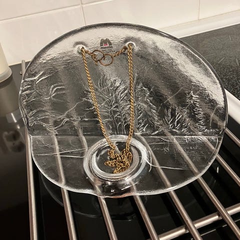 Toisessa tuikkualusta haljennut, katso kuva, joten tämän saa mukaan halutessaan (tästä ei siis lisähintaa). Haljennut ei välttämättä kestä lämmintä kynttilää.