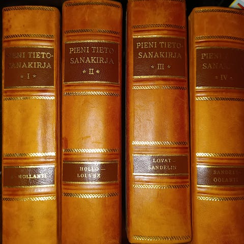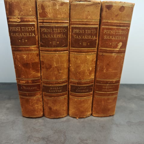 Pieni tietosanakirja, koko sarja, osa 1 painettu 1949, osa 2 1950, osa 3 1951, osa 4 1952, hinta yhteensä 5 e.