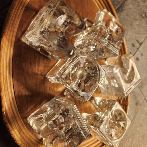 telineet. Materiaali kirkas lasi, korkeus 5 cm, leveys 5 cm, syvyys 5 cm, paino n. 200 gr/kpl.