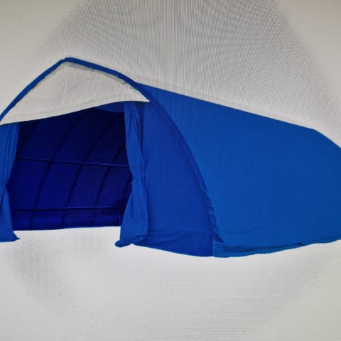 Sivusta aukeava pressukapelilava liukupressulla.Vanerilaidat noin 50 cm. Pituus 8,15m, leveys 2,55m, korkeus 3,15m. Hakusanat: pressutalli, halkovarasto, kevyttalli