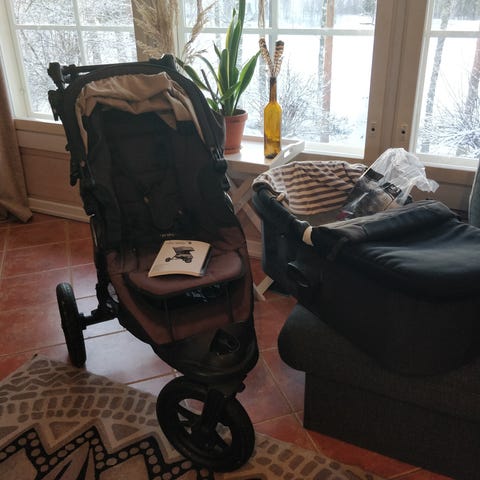 Vähäisellä käytöllä olleet, siistikuntoiset juoksurattaat. Mukana vaunukoppa, jota ei ole käytetty. Kopassa sadesuoja, hyttysverkko ja fleecepeitto. Sisältää pumpun renkaille, adapterit turvakaukalolle ja kopalle. Rattaissa käsijarru.