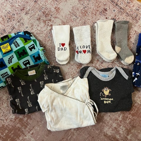 - 2 x polvesta paikatut housut (kokoa 6-12kk), automonsteri-housut koko 62 ja 2 x äitiyspakkauksen keltaiset housut kokoa 62-68