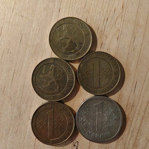 kourallinen (10) suomen 1970-1980-luvun nikkeli Markan kolikoita , somisteeksi tai pelimerkeiksi vaikka ?