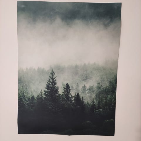 Kuva kiinnittynyt hieman epätasaisesti kehyksiin, ei ole häirinnyt itseä mutta erottuu tietyssä valossa. Kuva myös kärsinyt muuton aikana, näkyy kuvissa. L61cm K91cm