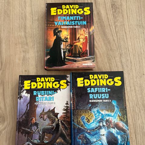 Myydään David Eddings:n Eleniumin taru- sarjan kaksi ensimmäistä kirjaa Timanttivaltaistuin ja Rubiiniritari kovakantisina versioina. Kunto kirjoissa hyvä ja ovat 1. painos 1996. Voin myös myydä yksittäin 15 euroa kappale.