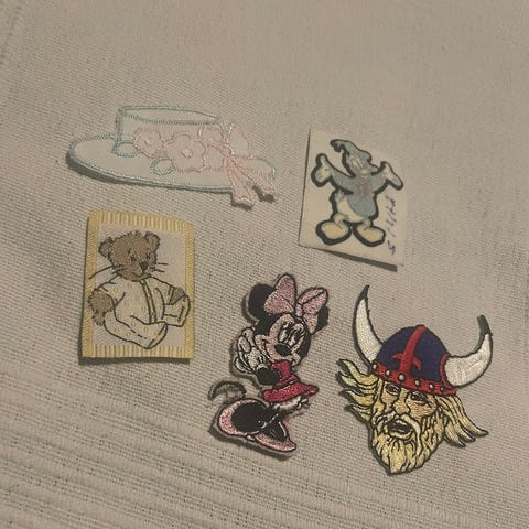 2 kpl kangasmerkkejä. Isompi on 8 cm x 14,5 cm ja ommeltava, pienempi on 6 cm x 8 cm ja silitettävä. Hinta yhteensä 10 e, vain nouto.