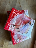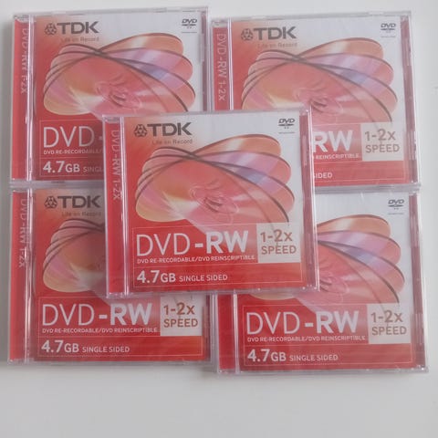 Myynnissä TDK:n laadukkaita DVD-RW-levyjä, avaamattomia pakkauksia.