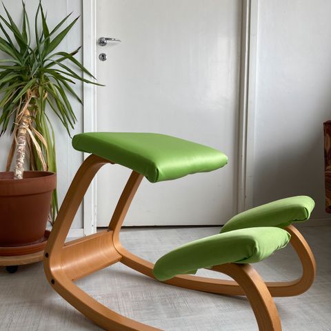 Ergonomic balance chair / kneeling chair, ideal for working from home. Of Scandinavian make, designed by Peter Opsvik, the designer of almost all ergonomic design furniture from the Stokke / Varier collection. The Stokke chair is the professional kneeling chair, very strong wooden balance frame, adjustable multifunctional back support, adjustable seat and knee supports.
