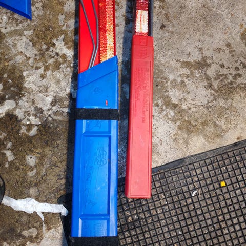 Kuvien mukaiset varoitus pylväät. Oli aikaisemmin ajoharjoitus käytössä eikä osumia saanut, joten lähes uudenveroiset. 20€ molemmat saa Tuusulasta noutaa.
