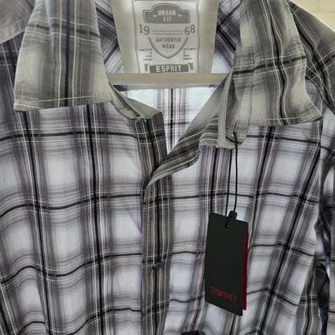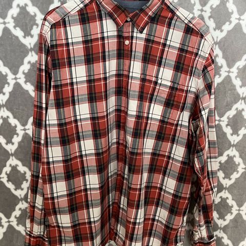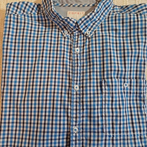 Lyhythihainen, ruudullinen khakinvihreä/harmaa puuvillapaita.
