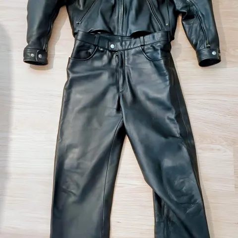 BMW hyvä kuntoinen nahkainen ajopuku (takki + housut). Unisex-malli koko 44 vastaa miesten kokoa 48 tai S/M. Sopii parhaiten 168-178cm hoikalle 70-78kg ajajalle. Itselleni tämä on jäänyt leveyssuunnassa pieneksi. Kuvassa oleva mies on 180 cm / 84 kg. Puku on hänelle liian pieni vyötäröltä.