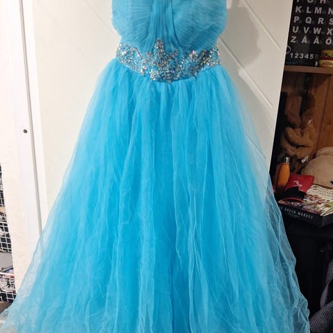 Käyttämättä jäänyt täyspitkä juhlamekko, koko S. Yläosassa paljetit ja helmet, helma pehmeää tylliä ja alla alushelma. Ostettu Zalandosta eikä ollutkaan sopiva.