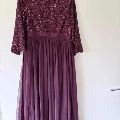Erittäin siisti, yhdet häät nähnyt ja kerran pesty hihaton, violetti puku, koko 38. Pituus olalta helmaan 92cm, vyötärö 76cm, kai-kai 47cm. Materiaali 100% polyester, silittämättä siisti, kreppimäinen mattapintainen sidos, joka on hengittävämpi kuin tiivis sidos. Miehusta vuoriton, hameosa vuoritettu. Hameosa edestä kaksinkertainen, päälliosassa hienostunut konekirjontakuvio.