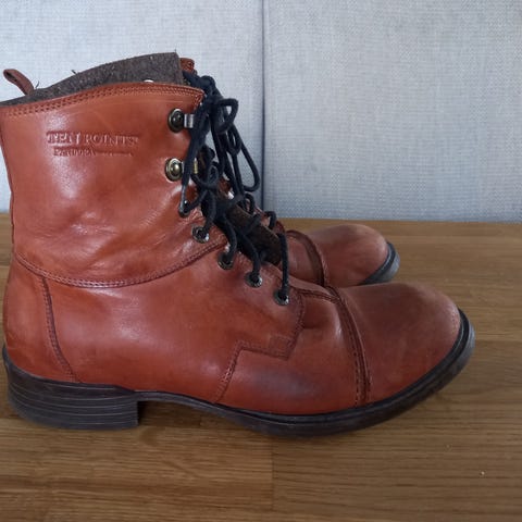 Käytetyt, mutta edelleen hyvät ja käyttökelpoiset Ten Points nilkkurit. Ostettu aikanaan Alppilan Kengän myymälästä. Vastaavat malliltaan hyvin paljon nykyistä Ten Points Pandora -mallia. Kengät ovat todella hyvät jalassa. Pohjassa ja nahassa on käytön jälkiä ja kulumaa, jotka näkyvät kuvissa.