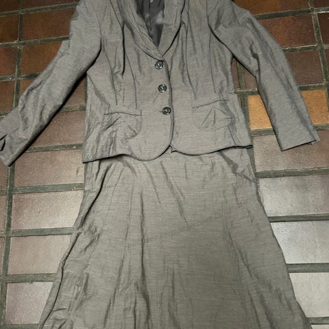 Jakussa on vetoketjukiinnitys, kaksoislukko, jolloin ketjua voi avata helmasta päin esim. autoilua mukavoittamaan. Pituus olalta 61cm, kai-kai 48cm. Jakun saumoissa sekä edessä, että takana, sekä taskun suissa ja vielä housujen vyötäröllä on kauniit koristetikkaukset. Jakun vuorikangas on myös tyylikäs, violetti/harmaaraitainen. Asua on pidetty kaksi kertaa juhlatilaisuudessa, housut on pesty ja jakku on tuuletettu.