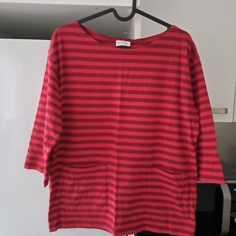 Hyväkuntoinen, mustavalkoraidallinen Marimekon vintage-t-paita. Paksua, napakkaa trikoota. Kaunis venepääntie. Hieman pintanyppyä, mutta ei häiritsevästi. Siistit kainalot.