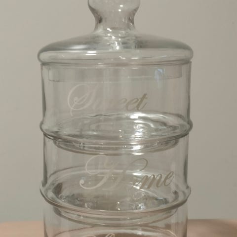 Virheetön, kaunis sini-valkoinen purkki romanttisilla kuvilla. Made in Belgium. Materiaali: karkaistu lasi. Korkeus 12,5 cm.