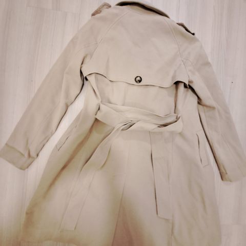 20 vuotta sitten ostettu Vero Modan luonnonvalkoinen trenssi, koko XS. Ei mitään mainittavia vikoja, pieni viivamainen tahra olkapäässä (kts. viimeinen kuva). Vastaa kokoaan. Takissa on sisävuori.