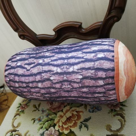 Uusi tukkikuvioinen tyyny Sisällä tukeva vaahtomuovie. Pituus 43 cm ja halkaisija 13cm. Kivat tyynyt selän taakse tai niskan tueksi, koristeeksi sohvalle.
