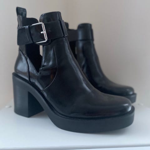 Zaran mustat kiiltopintaiset leveäkorkoiset nilkkurit säädettävällä remmillä kokoa 38.