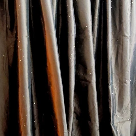 2 punaista sifonkiverhoa joissa ommellut koristeet ja ripustuslenkit.
