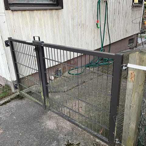 Neliötankojen ympäri olevien lehtien alla on vähän ruostetta. Muuten portti on oikein hyvässä kunnossa. Portti on alkuperäinen musta.