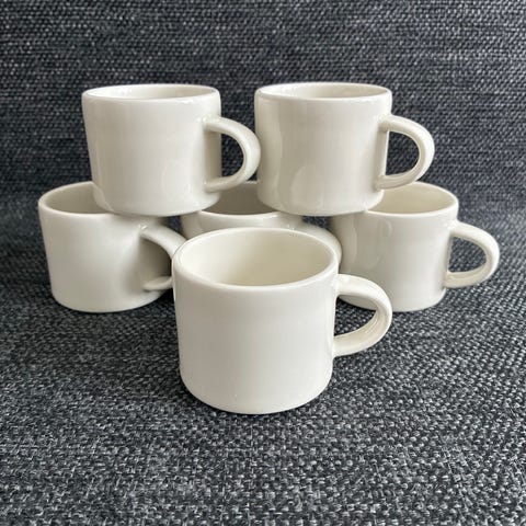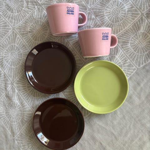 Arabian Koko XS, Kati Tuominen-Niittylä, vaaleanpunainen ja valkoinen espressokuppi ja Koko Presso XS espressokupit 2 kpl sekä KoKo ruskeat 2 kpl ja turkoosit lautaset 2 kpl , kaikki ehjiä, hyväkuntoisia, kuppi kork. n. 5 cm, halk. n. 6 cm, lautanen halk. 10 cm, kuvan neljän setti yht. 50 eur