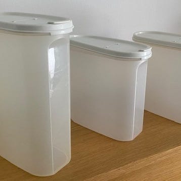 Käyttämätön setti Tupperwaren ilmatiiviitä Clear Canister säilytysastioita. Korkeamman tilavuus 1,3 L. Matalamman tilavuus 780 ml